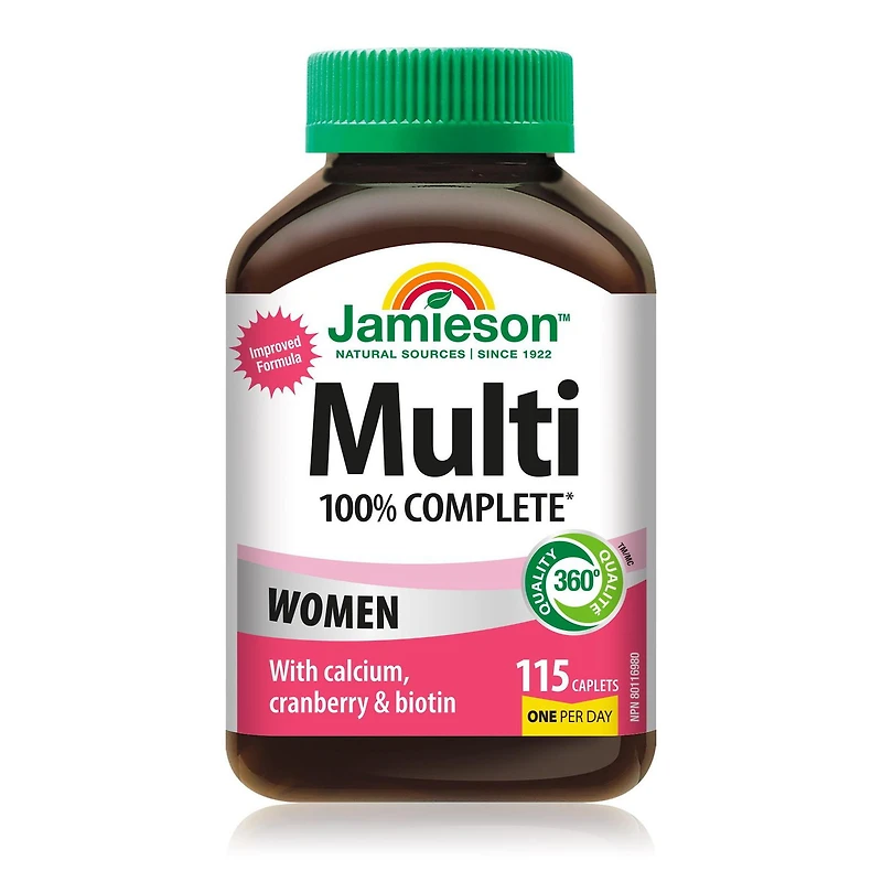 100% Complete Multivitamin for Women is the easy way to get 100% of your body's daily vitamin needs. Formulated to Health Canada’s recommendation, 100% Complete Multivitamin for Women also includes cranberry for urinary tract health, so you can feel confident you are getting 100% or more of the vitamins your body needs each day.