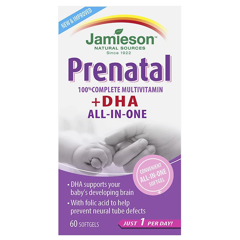 The convenience of 1 pill a day. Source of Omega-3 (DHA) to support your baby's health and development during and after pregnancy. Contains folic acid to prevent neural tube defects. Source of antioxidants Jamieson Prenatal Complete with DHA is a complete prenatal multivitamin and source of Omega-3 (DHA) to support your baby's health and development during and after pregnancy | Jamieson Prenatal Complete Multivitamin with DHA Size 60s