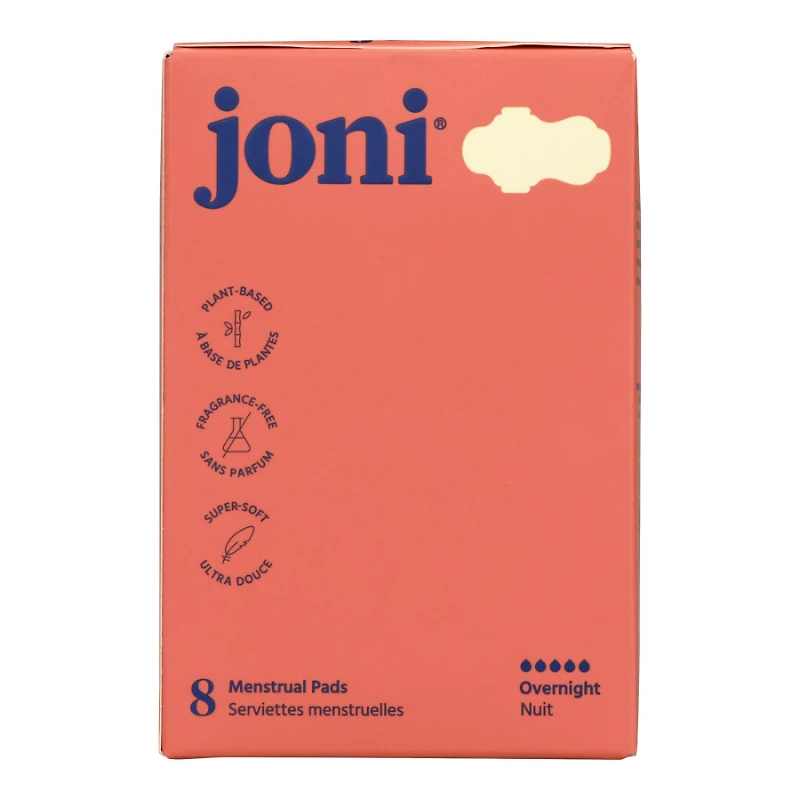 Update your menstrual protection with Joni Sanitary Pads. These sanitary pads are fragrance-free and made from corn fibre and organic bamboo. Made for overnight use, they are suitable for light flow and feature a soft, breathable design. Take comfort knowing they are biodegradable, individually wrapped in a compostable wrapper, and nested in recyclable packaging. These organic overnight pads do not contain chemicals, plastic, chlorine, or dioxin. Make the choice that's right for you with Joni Sanitary Pads | Joni Sanitary Pads - Overnight - 8's Size 8s