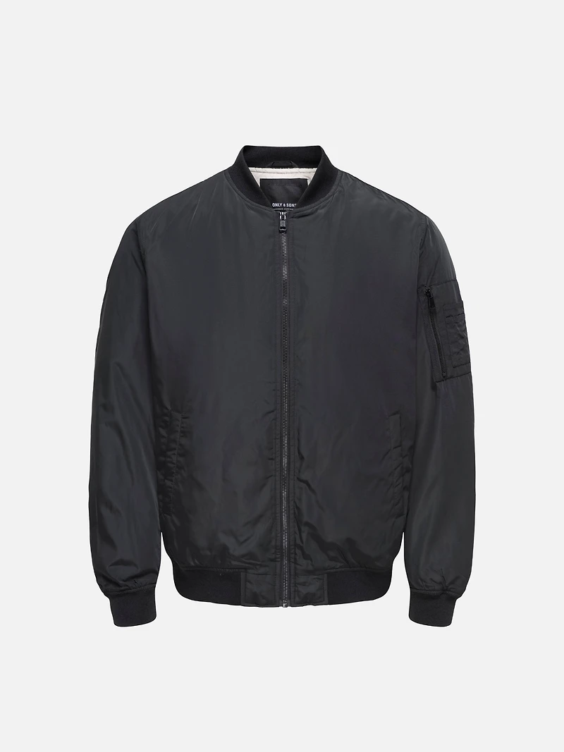 A transitional piece for the in-between, the Only & Sons Joshua Bomber Jacket is designed with the classic silhouette for easy styling. Lightweight padding runs through the body and sleeves, while stretch rib-knit trims run along the hem, cuffs, and baseball style collar for the finishing touch. Zip-up padded bomber jacket Elasticated ribbed cuffs and waistband Two front pockets, one sleeve pocket 100% recycled polyester shell and lining, 100% polyester padding Style no.: 22023287