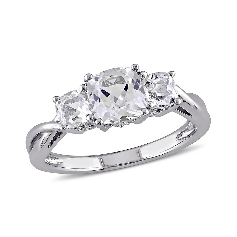Tell her your heart belongs to her with this stylish three stone engagement ring. Crafted in lustrous white gold, ring features 3 cushion cut, prong set created white sapphires, accented by 10 round shaped, pave set icy diamonds (G-H, I1-I2). Polished to brilliance shine, this ring will be her beautiful companion for years to come.