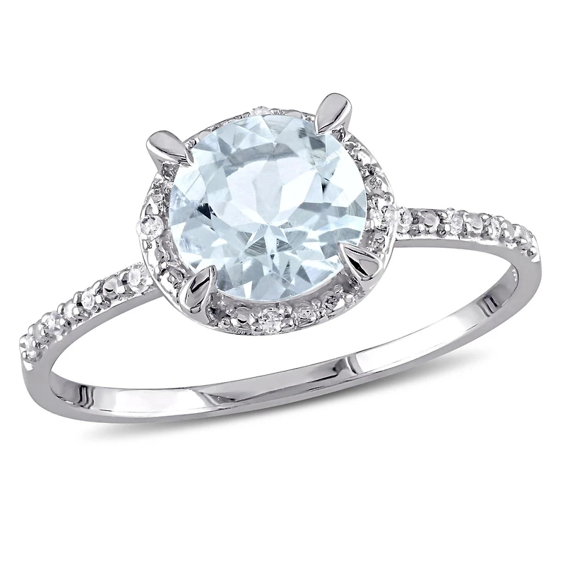 Show off your stylish flair by donning this halo ring from our Collection which features a round-cut aquamarine center stone and attractive round white diamond side stones. This shimmering cocktail ring is crafted in 10-karat white gold and is enhanced with a high polish finish.