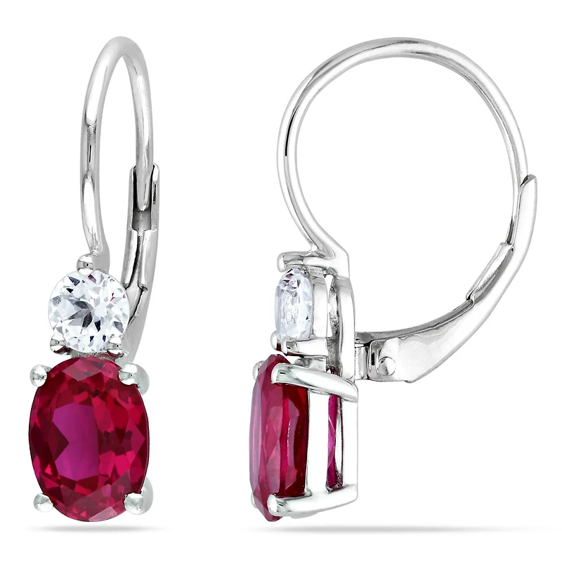 These leverback earrings feature created ruby ovals accented with single created white sapphires. The earrings are crafted of sterling silver.