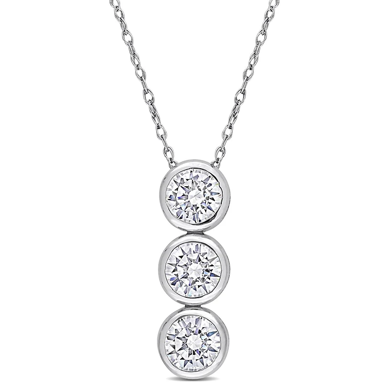 This cubic zirconia three-stone drop necklace is crafted in sterling silver. This cubic zirconia three-stone drop necklace is crafted in sterling silver. This classic pendant features three round-cut cubic zirconia gemstones. Enhanced with a high polish finish, this gemstone necklace is hung on a cable chain and is secured with a spring ring clasp. A stunning addition to any jewellery collection.
