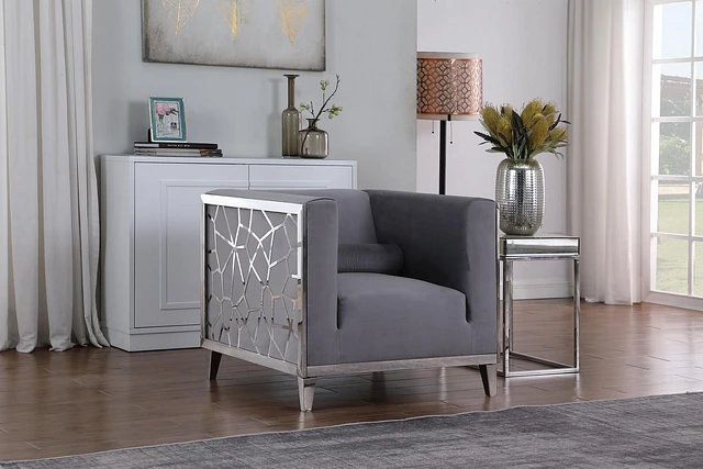 K-Living Darlene Grey Plush Velvet Chair With Chrome Stainless Steel Detailing on Arms