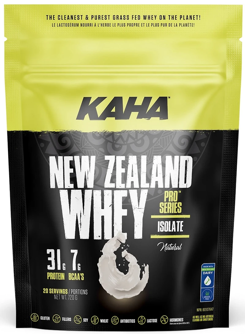 Kaha Nutrition - Kaha New Zealand Whey Isolate - 720 Grams - NPN : 80034945New Zealand Whey Pro-Series ISOLATE is designed for Active Individuals, Seniors, and Lacto-Vegetarians.Our Isolated formula only uses Cross Flow Microfiltration (CFM) processing, which results in a 100% undenatured whey protein product. Isolated whey also yields a high percentage of protein and contains NO Fat and Lactose. It is rapidly absorbed by the body because it’s water soluble, making it ideal for Athletes and Seniors who break down muscle proteins at a quick rate. It will also benefit Lacto-Vegetarians who lack protein from their diet.This unique formulation contains a full range of Amino Acids involved in muscle protein synthesis, it assists in the building of lean muscle mass when combined with regular resistance training and a healthy balanced diet. It’s also a great source of protein to help build and repair body tissues.Your Trusted Source for Purity