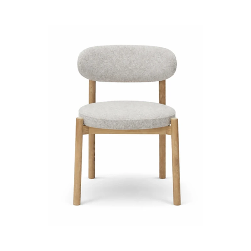 The Kaia Dining Chair features a soft upholstered seat paired with a solid oak wood frame. Its curved backrest and clean lines make it a comfortable and stylish addition to any dining room.
