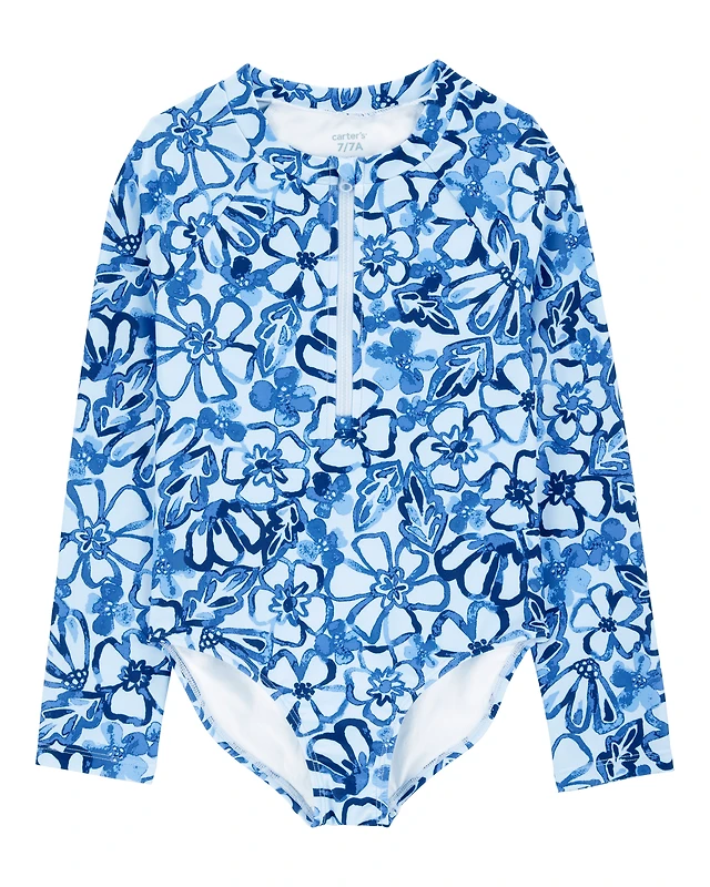 Kid 1- Piece Floral Long-Sleeve Rashguard Swimsuit - Blue