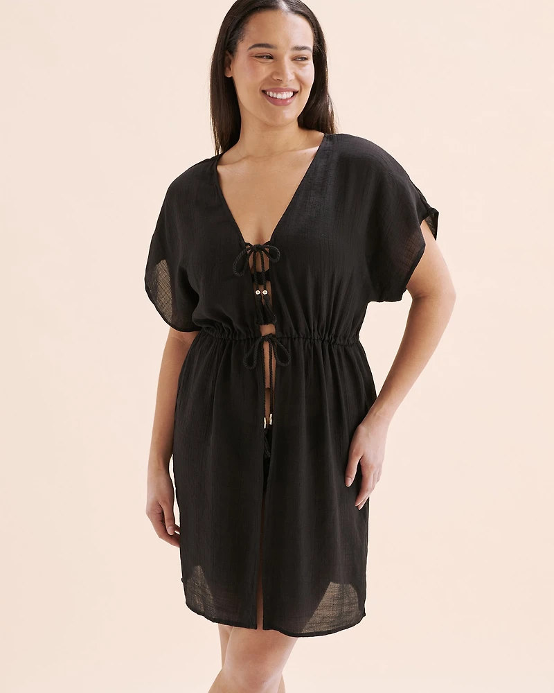 Light as a summer breeze, this black voile kimono is the perfect piece for strolling along the beach at sunset. With its short sleeves and adjustable drawstring adorned with delicate gold beads, it can be worn open for a flowing, airy look or cinched to gently shape the silhouette. This kimono is more than just a cover-up, it's a statement of style and attitude.