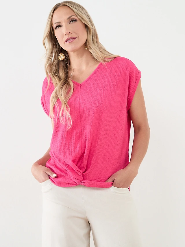 Knot Front V-Neck Top with Shoulder Detail
