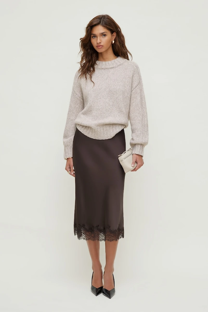 This skirt is made from silky satin with a hint of stretch for an effortless, flowy drape that moves with you. It's designed to sit at your waist with a relaxed fit and has a lace trim for a sultry touch. Style it with a