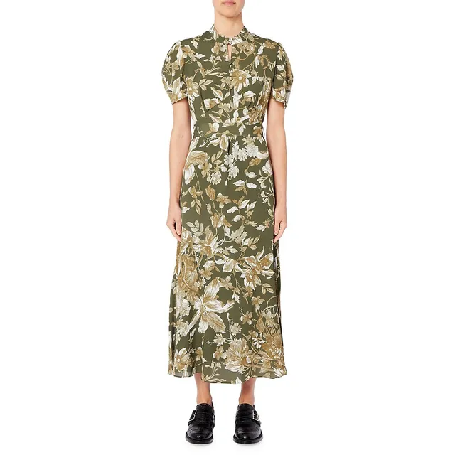 Laurea Floral Puff-Sleeve Belted Midi Dress