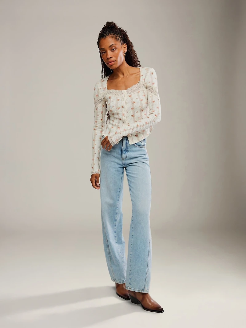Added lace trims give the Free People Let's Party Printed Cardi Top a feminine twist to the longsleeve waffle shirt. Designed with a button closure up the front for versatile styling options, a curved hem rounds out the look.