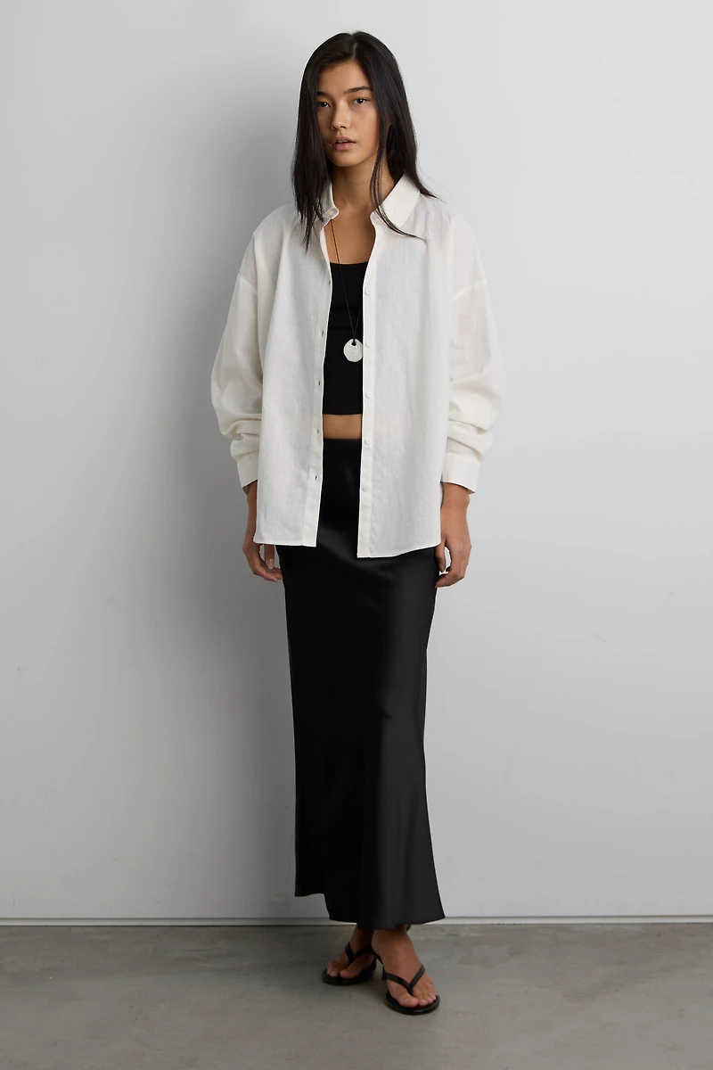This button up shirt is made from a lightweight linen blend in a relaxed fit. The perfect choice for the warmer days ahead, wear yours as a set or pair it with a tank and a midi skirt.