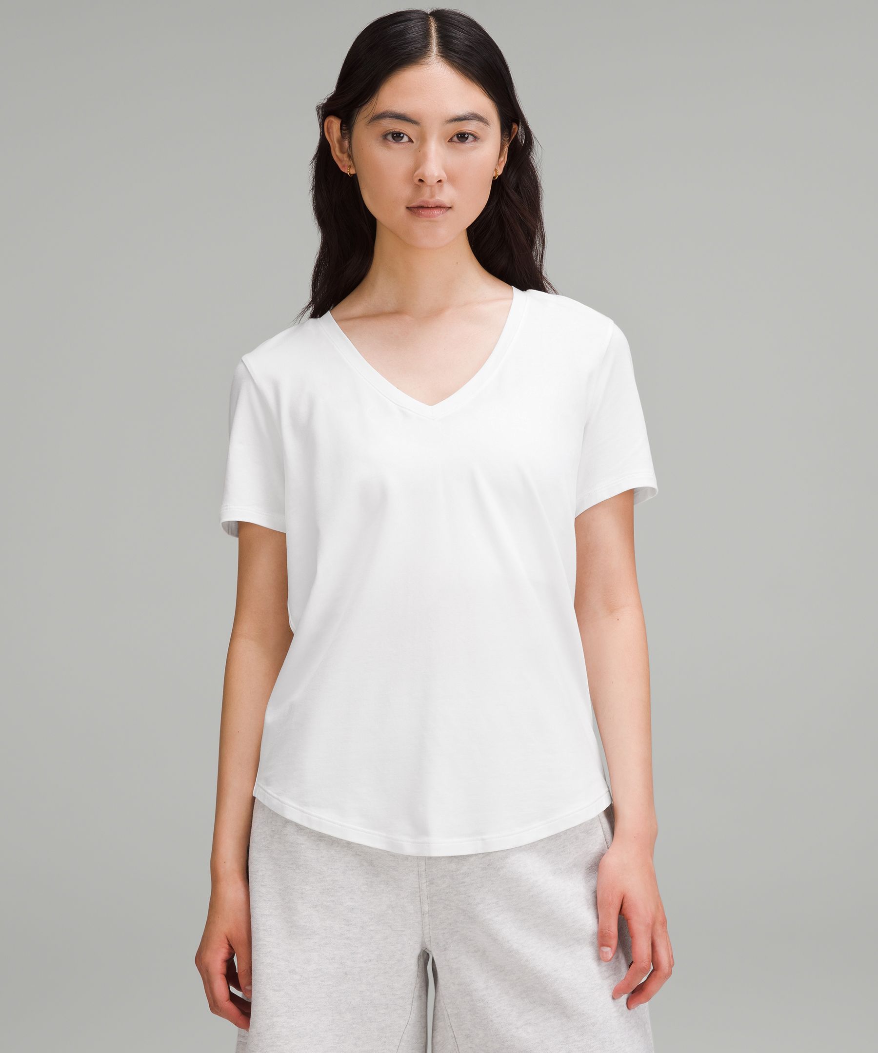 Lots of reasons to love this tee. Soft cotton fabric, a hint of stretch, and a just-right curved hem that pairs perfectly with leggings.