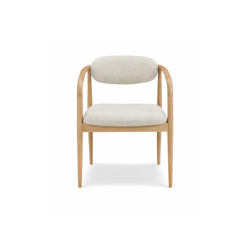 The Luka Armchair combines soft linen fabric with a solid ash wood frame, offering a natural, warm aesthetic. Its curved back and plush cushioning make it suitable for living rooms, lounges, and bedroom corners.