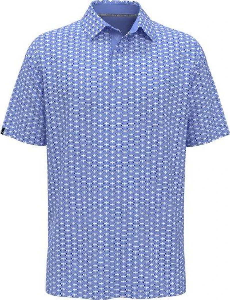 Hit the course in sophisticated style with this men's golf polo from Callaway Apparel, featuring a distinctive albatross geo print. Crafted from a single knit fabric, this high-performance golf shirt incorporates recycled polyester, delivering comfort and modern aesthetics. Opti-Dri™ moisture-wicking technology keeps you dry by moving perspiration away from your skin. Swing Tech™ engineering and integrated stretch allow for an unhindered range of motion with every dynamic swing. Built-in sun protection safeguards your skin from harmful UV rays. With a classic self-fabric collar and short sleeves, this polo is engineered for peak performance and timeless elegance on and off the course.