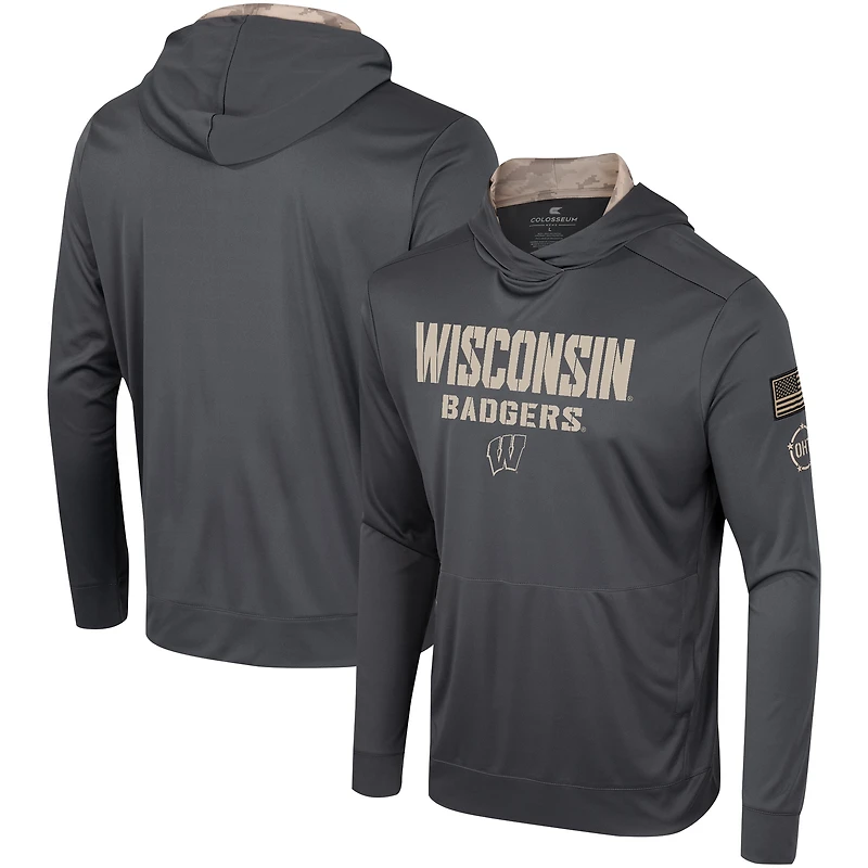 Men's Colosseum Charcoal Wisconsin Badgers OHT Military Appreciation Long Sleeve Hoodie T-Shirt in Coquitlam, BC
