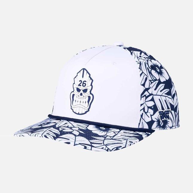 Nothing says “laid back” like our Darkness Tiki Skull 5-Panel Curved Bill Hat. Wrapped in our tropical Aloha print in navy and white, the hand-drawn Hawaiian flowers, leaves, and Darkness Tiki emblem bring a festive vibe to your next outdoor adventure. Finished with rope detailing and an adjustable snapback closure.