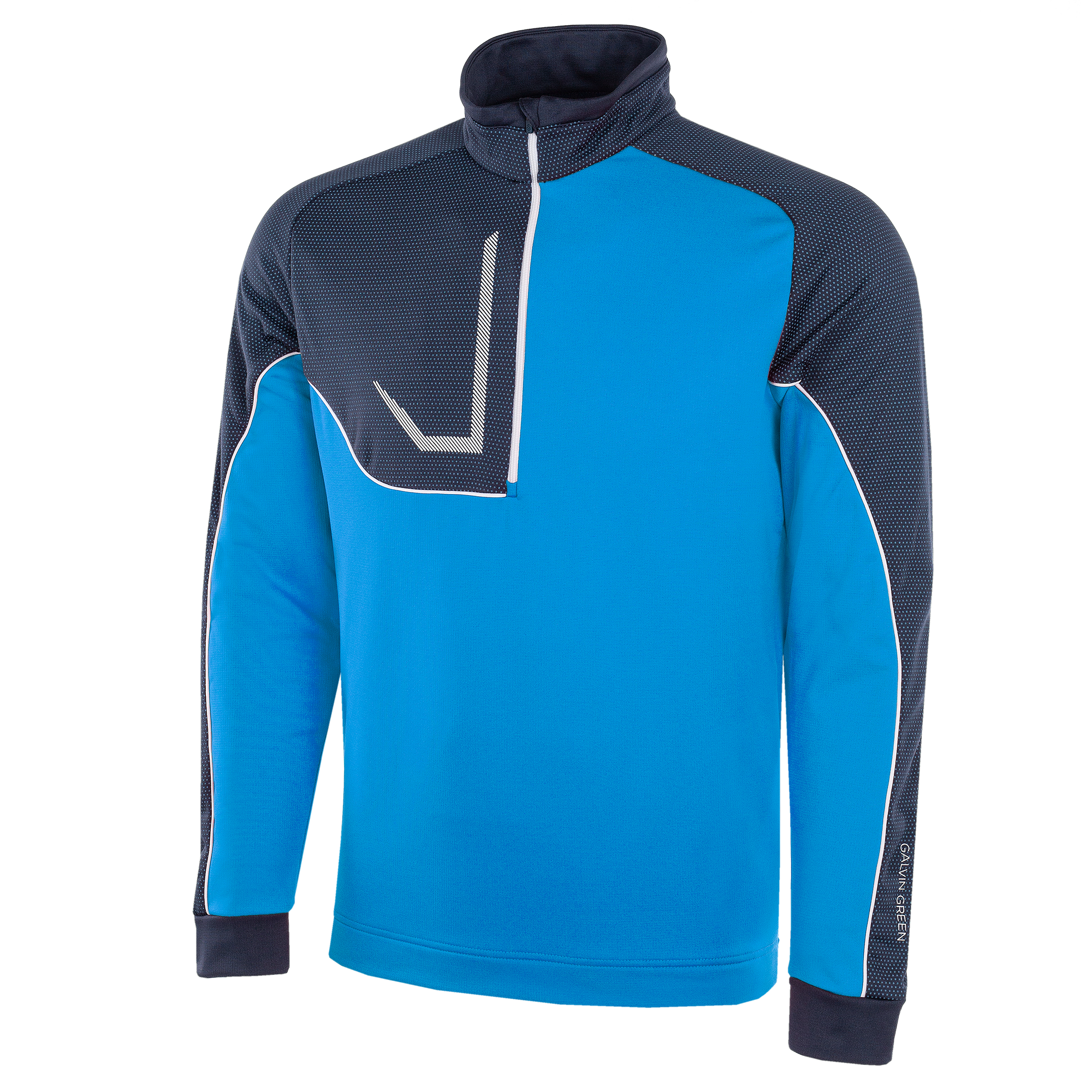 The half-zip sweater delivers outstanding thermal insulation. Durable, breathable and easy care. Details such as pipings and prints make it very presentable both on and off the course. This garment belongs to a new eco-generation of INSULA™ fabric made 100% from recycled plastic bottles. Size up for a looser fit.