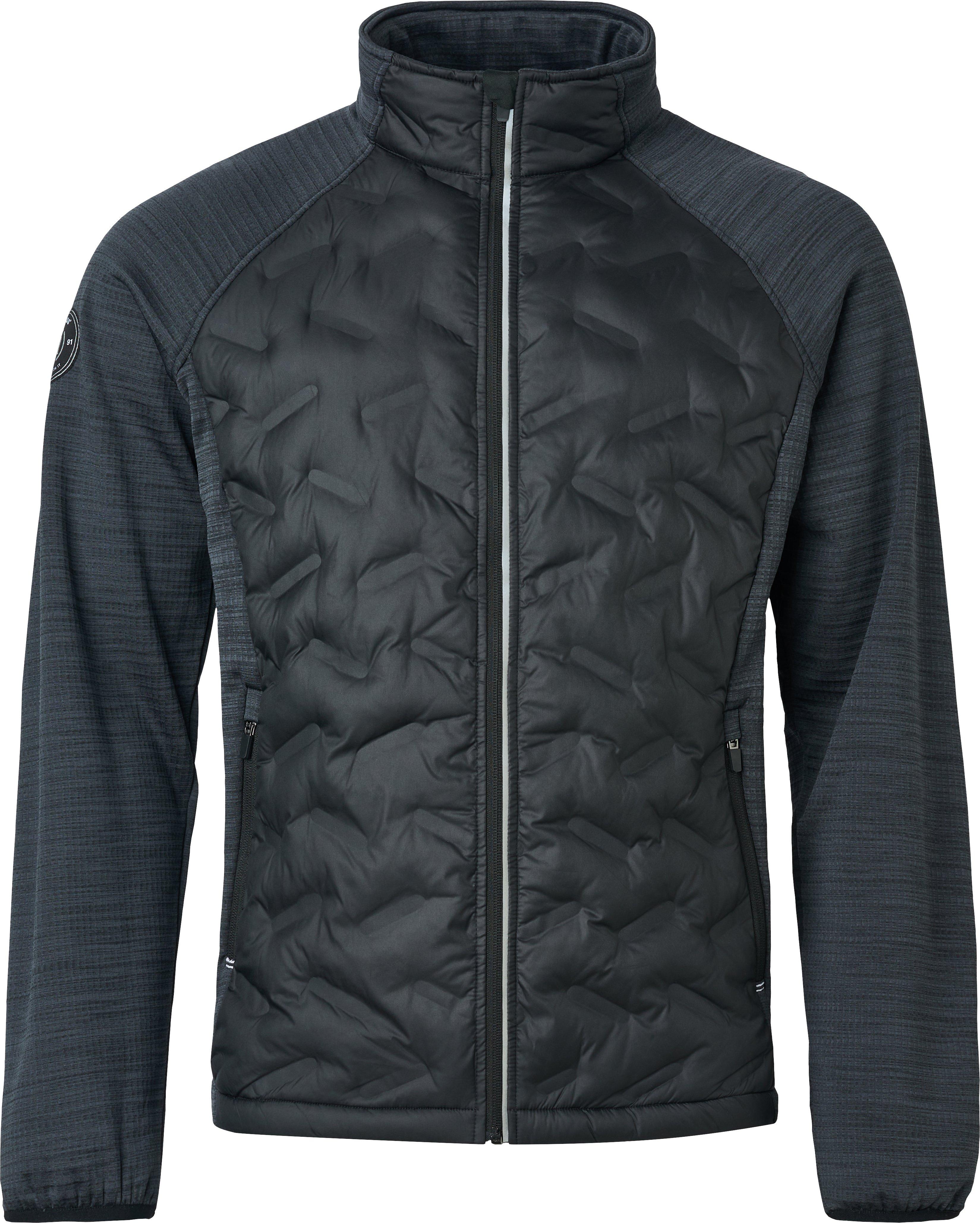 Elgin Hybrid jacket has a seamless quilted windproof fabric which is padded at front and back body. The side panels, sleeves and shoulders are made of a very stretchable fleece.  Fleece is brushed on the inside and has a square pattern for better air circulation that will keep you warmer.  Full zipper at front with reflective piping and two front pockets.  Abacus logo at right sleeve.