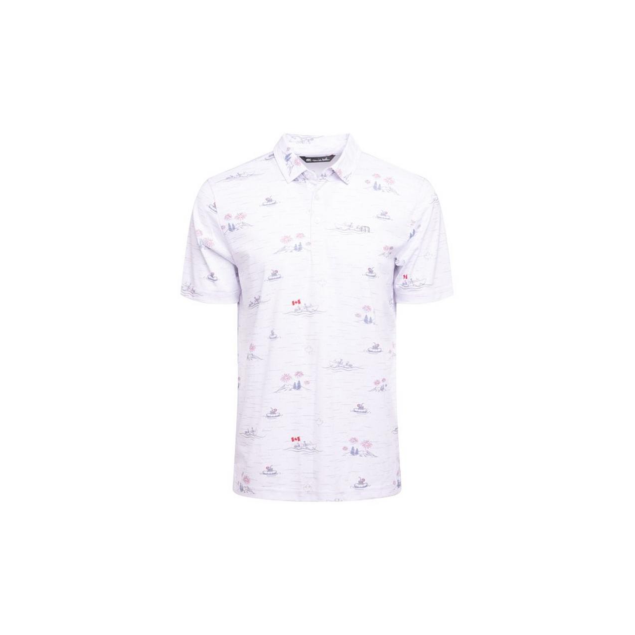 Celebrate Canada Day in the LAKE BREAK polo, designed with a patriotic pattern featuring beer, boating, fireworks, and the Canadian flag.