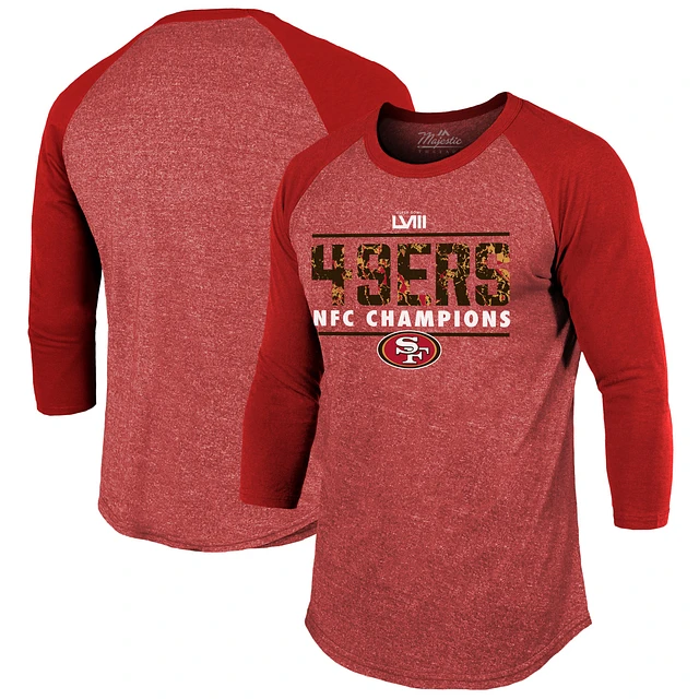 Men's Majestic Threads Scarlet San Francisco 49ers 2023 NFC Champions Tri-Blend Raglan 3/4-Sleeve T-Shirt