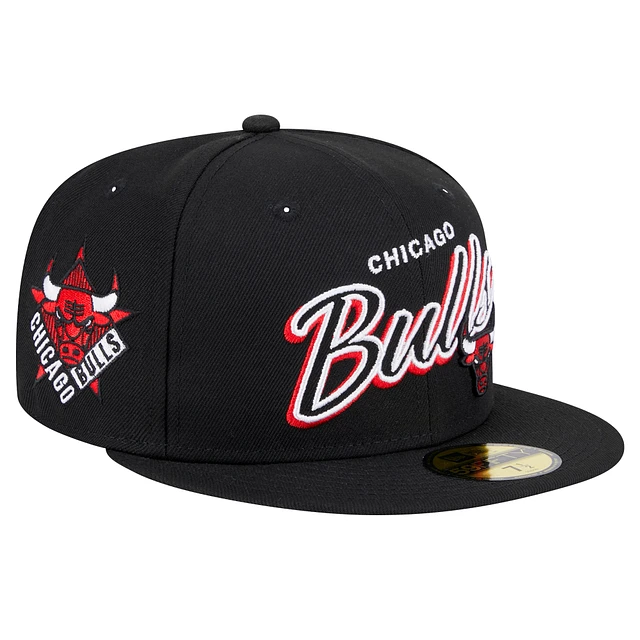 Men's New Era Black Chicago Bulls Sport Night Script Sided 59FIFTY Fitted Hat