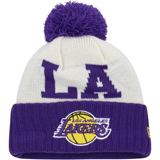 Men's New Era Purple/Cream Los Angeles Lakers 2022 NBA Draft - Cuffed Knit Hat with Pom