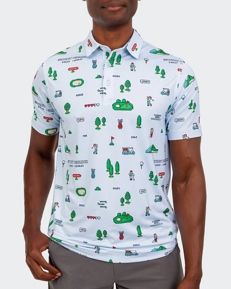 In Super Waggle land, every hole is a new adventure. If your favorite memories are in 8-bit, jump the sand, collect a few birdies and level up in this high-performance retro men's golf polo.