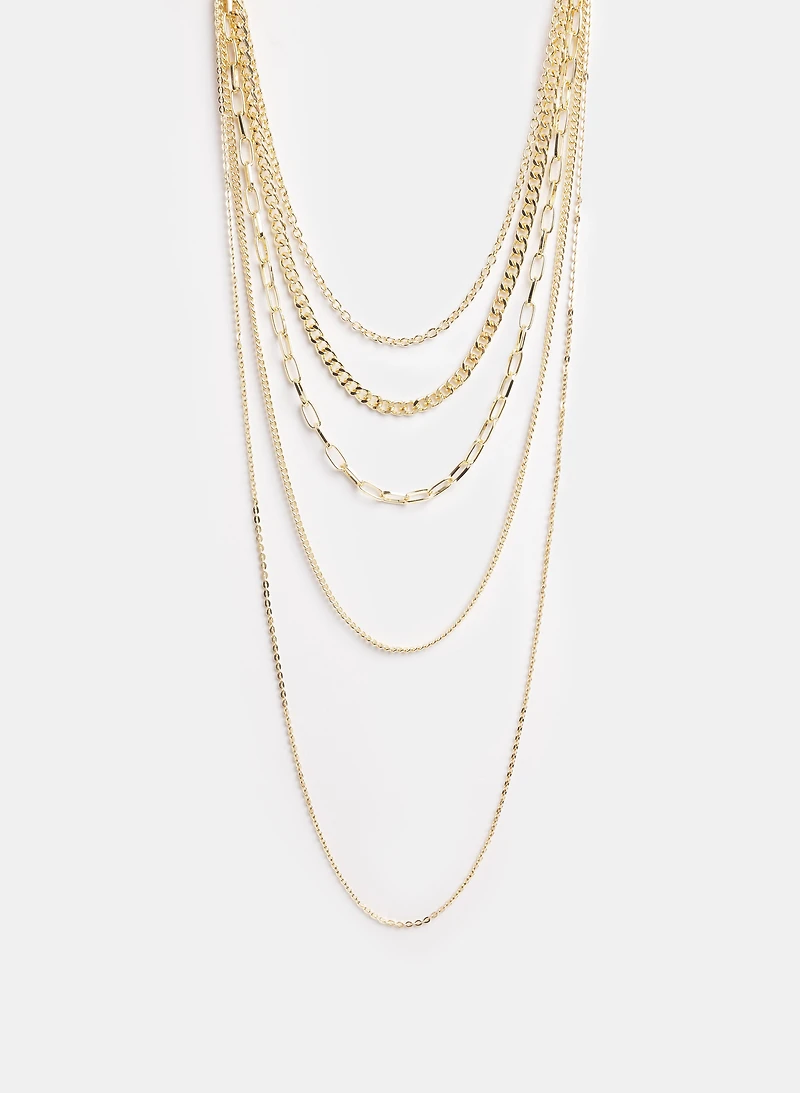 A versatile mixed chain necklace that adds a stylish, layered touch to work looks and evening ensembles. Pair it with simple tops or minimal jewelry for a polished, contemporary finish.