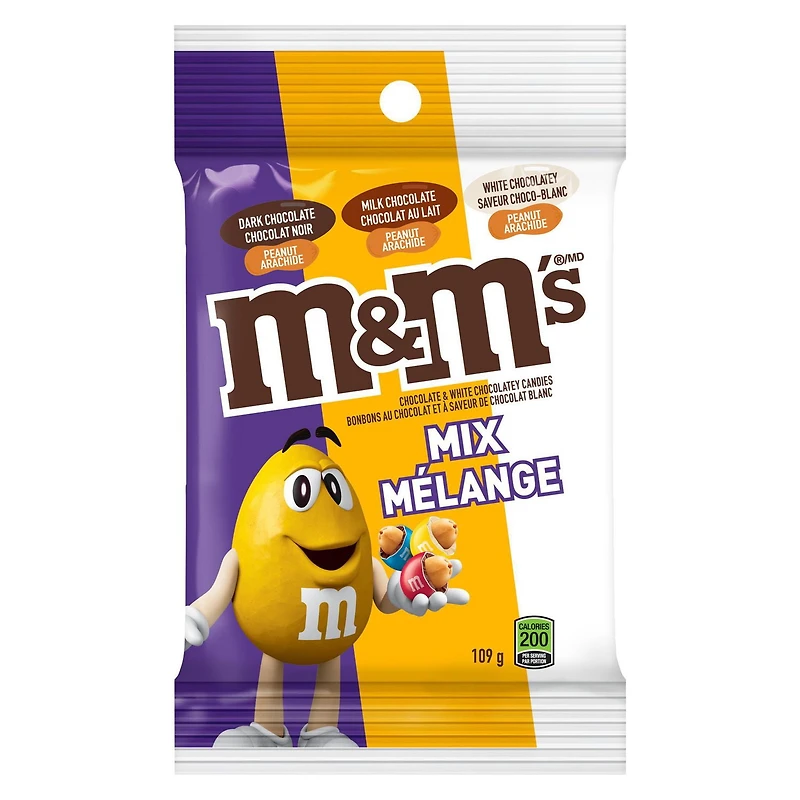 Shake up your day with NEW M&M'S Peanut Mix Chocolate Candy packs. M&M'S Peanut Mix features M&M'S Dark Chocolate Peanut, M&M'S Milk Chocolate Peanut, and M&M'S White Chocolate Peanut candy together in one bag. What's better than enjoying just one of these delicious peanut M&M'S candy flavours? Enjoying all three at once! This exciting mix will please every chocolate candy fan. Break this fun chocolate candy assortment out as an after dinner dessert or add it to your movie night candy spread. This Sharing Size pack contains enough peanut chocolate candy for everyone to enjoy this fun flavour combo.