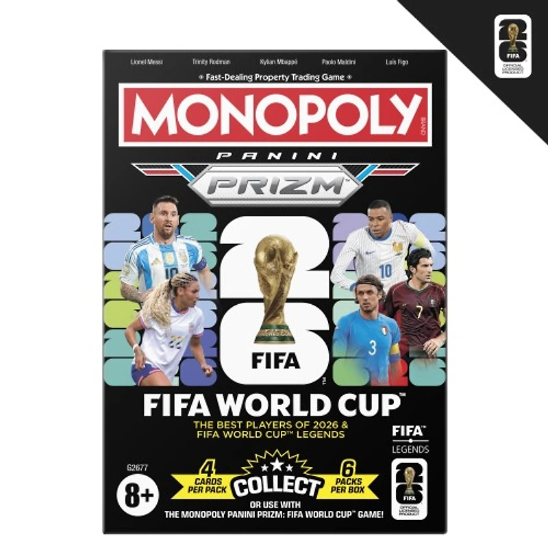 Collect, trade, and compete with the Monopoly Panini Prizm: FIFA World Cup Trading Cards booster box! It includes 24 Monopoly Panini Prizm FIFA cards, designed for collecting or playing with the Monopoly Panini Prizm: FIFA World Cup board game for teens, kids ages 8+, and adults. In each pack, look for randomly inserted Monopoly Panini Prizm parallels and ultra-rare cards! If using the Panini Prizm cards in the Monopoly Panini Prizm: FIFA World Cup board game, players can choose and trade FIFA players to build a world-class team. Compete against opponents by comparing Player Ratings and Stats on the backs of the cards. Monopoly Panini Prizm booster boxes and FIFA WORLD CUP soccer card packs make fun stocking stuffers, Easter basket stuffers, white elephant gifts, and cool gifts for FIFA fans.