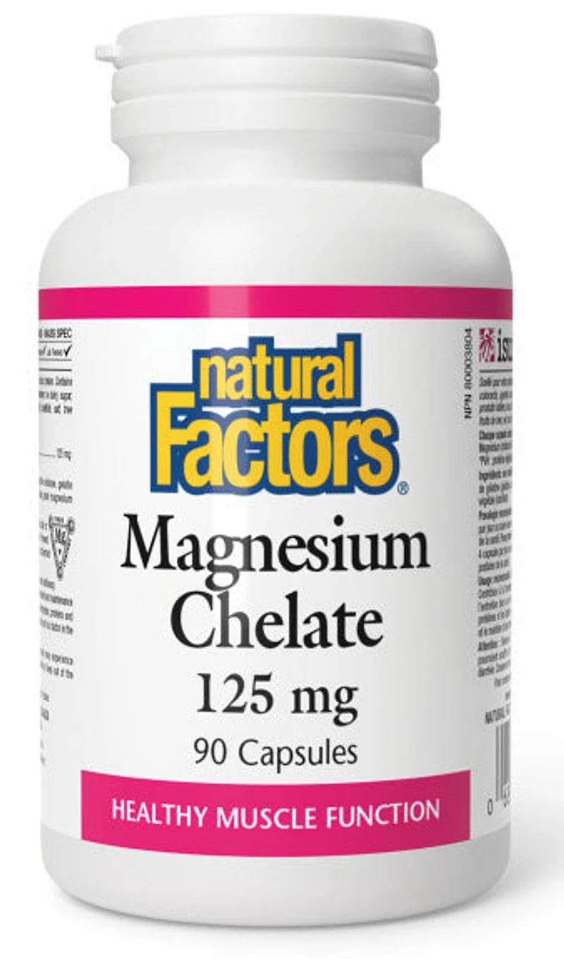 NATURAL FACTORS - Magnesium Chelate - 90 Capsule(s) - NPN: 80003804Natural Factors Magnesium Chelate 125 mg is chelated to ensure optimal absorption and utilization. Magnesium helps maintain healthy muscle function and good health. It also helps in the development and maintenance of healthy bones and teeth, as well as in metabolizing carbohydrates, proteins, and fat.