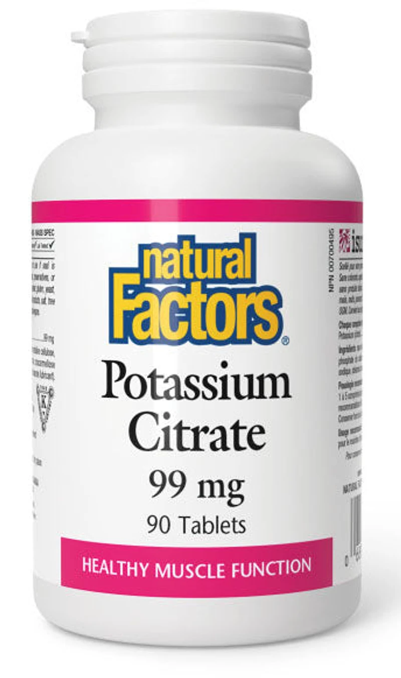NATURAL FACTORS - Potassium Citrate - 90 Tablet(s) - NPN: 00700495Potassium is one of the most important minerals in the body. It plays many important roles in the body such as controlling the body’s water balance, regulating nerve signals from the brain and spinal column to our muscles, and promoting healthy nerve and muscle function. It also aids in maintaining stable blood pressure, regular heart rhythm, and a healthy nervous system. The citrate form of potassium is well absorbed and well tolerated by the digestive system, making Natural Factors Potassium Citrate a great choice for individuals with digestive sensitivities.A mineral supplement for the maintenance of good health INGREDIENTS Each tablet contains: Potassium (potassium citrate) 99 mgNon-medicinal IngredientsMicrocrystalline cellulose, dicalcium phosphate, croscarmellose sodium, vegetable grade magnesium stearate (lubricant).DIRECTIONSAdult dose: 1–5 tablets daily or as directed by a health care practitioner.CAUTIONSContains no artificial colours, preservatives, or sweeteners; no dairy, starch, sugar, wheat, gluten, yeast, soy, corn, egg, fish, shellfish, animal products, salt, tree nuts or GMOs. Suitable for vegetarians/vegans.