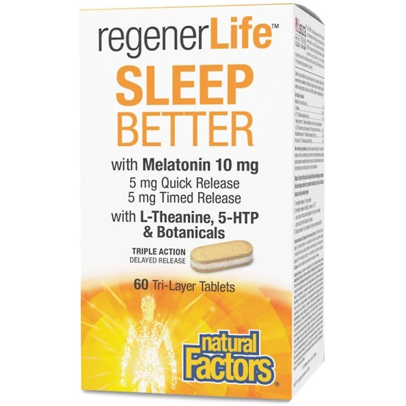 Natural Factors Regenerlife Sleep Better features 10 mg of melatonin alongside 5-HTP, L-theanine, and a botanical sleep blend to support healthy daytime energy through a better night’s rest. The advanced tri-layer tablets release 5 mg of melatonin immediately along with other relaxing and sleep-supportive ingredients to help you fall asleep faster, followed by a gradual release of 5 mg of melatonin to help you stay asleep longer. Simply take one non-GMO, vegan-friendly, triple-action tablet at or before bedtime.Adult dose: All uses except jet lag: 1 tablet with food once daily, at or before bedtime, or as directed by a health care practitioner.Jet lag: 1 tablet with food once daily at bedtime, while travelling, and at destination until adapted to the new daily pattern, or as directed by a health care practitioner.All uses: Consult a health care practitioner for use beyond 4 weeks.
