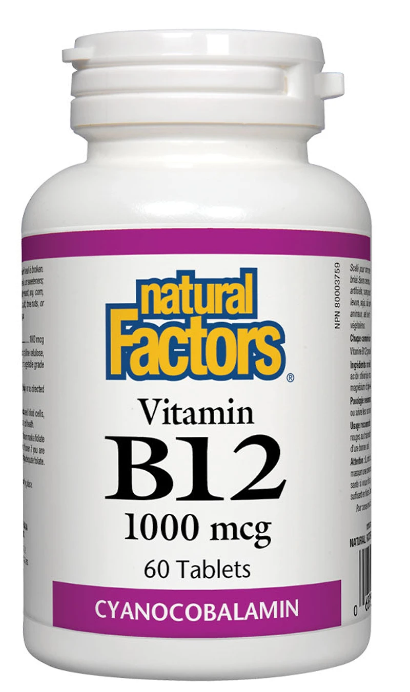 Supports the nervous systemHelps memory and learningBoosts energyHelps control homocysteine levelsPromotes a healthy cardiovascular systemDescriptionNATURAL FACTORS - Vitamin B-12 - 60 Tablet(s) - NPN: 80003759 -- An essential nutrient and a member of the B complex family of vitamins, vitamin B12 acts as a coenzyme for normal DNA synthesis, prevents nerve damage, and promotes growth, cell and blood cell development.Vitamin B12 aids folic acid in regulation of the formation of red blood cells, and helps in the utilization of iron. It is also required for the proper digestion and absorption of foods, the synthesis of proteins, and the metabolism of carbohydrates and fats. B12 plays a role in nervous system function with the production of myelin, the protective sheath around nerves, as well as the production of a neurotransmitter that helps with memory and learning.Vitamin B12 is water-soluble and is the only B vitamin that can be stored in the body, mainly in the liver. Deficiencies are commonly linked to an inability to effectively absorb vitamin B12 from the intestine, or to individuals who consume a strict vegetarian diet, since the vitamin is found primarily in foods of animal origin.Natural Factors Vitamin B12 is in the cyanocobalamin form which is the most studied and most stable form of vitamin B12. It is free of artificial preservatives, colours, and sweeteners.INGREDIENTS