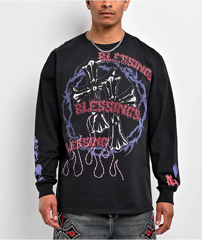 The designers at Ninth Hall introduce the Maxxxed Out long sleeve t-shirt in a black colorway. Colorful mall goth graphics, including crosses and brand script, decorate the front, back, and sleeves of the streetwear top.