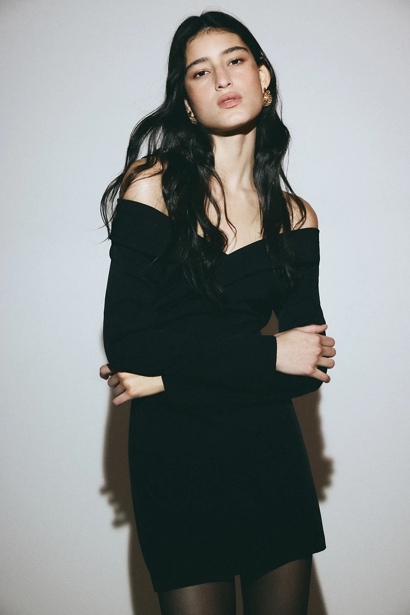 Short, fitted, off-the-shoulder dress in woven fabric. Foldover upper edge, softly shaped V-neck at front, and long sleeves. Sewn wrapover front with pleats at one side and a concealed zipper at other side. Unlined.