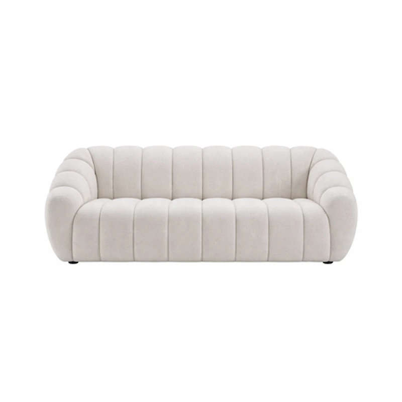 The Olimpia 3 Seater Sofa offers a refined blend of comfort and craftsmanship. Its curved silhouette is accented with large stripe detailing that adds visual softness to any living space. Upholstered in linen fabric in a pebble tone, the sofa presents a textured, inviting surface that enhances relaxation. Designed as a stylish centerpiece, Olimpia suits both contemporary and transitional interiors