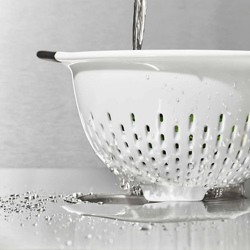 The OXO SoftWorks 3-Qt/2.8-L Colander is an efficient tool for rinsing veggies and straining pasta. Contoured feet keep Colander steady in sinks, and the non-slip handles provide a comfortable grip, even when your hands are wet. The elevated design keeps colander away from the bottom of the sink to prevent pooling. The sturdy construction can handle heavy food and the smooth material is easy to clean. Dishwasher safe.