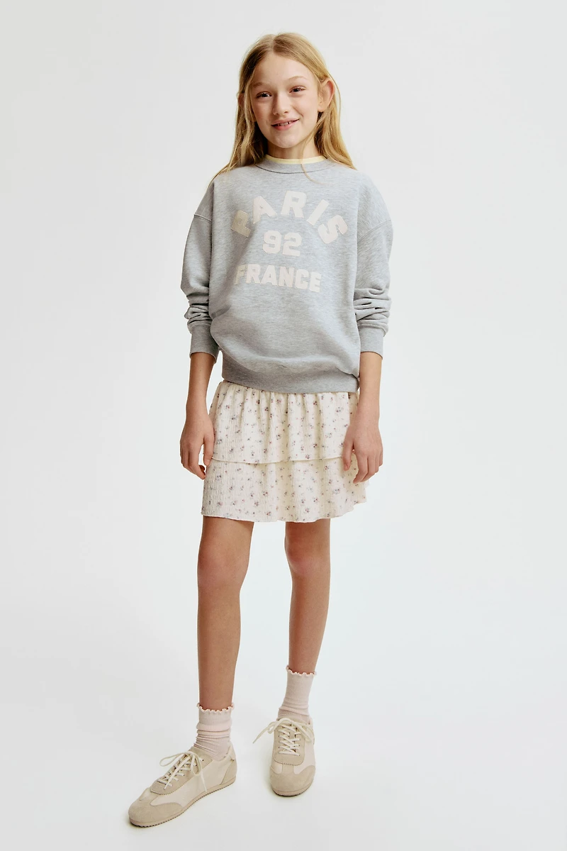 Tiered skirt in crinkled jersey with a pattern. Smocked waistband, overlocked edges, and liner shorts in soft jersey.