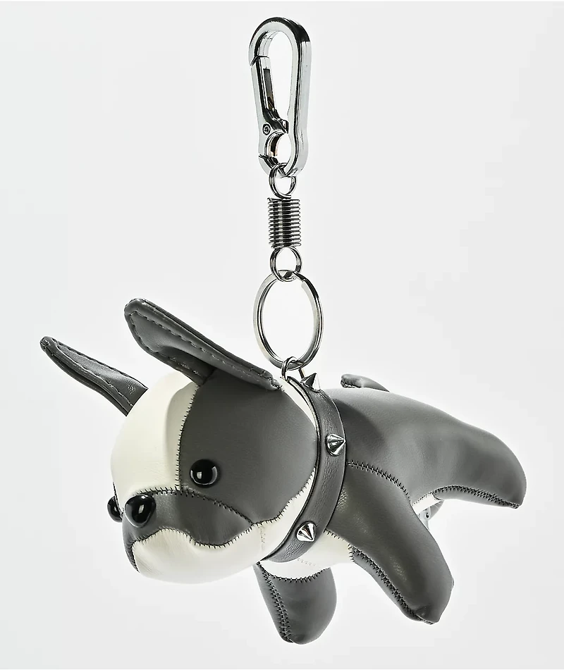 Edgy details give the Dog Eat Dog grey plush keychain from Petals and Peacocks a gothic look. The faux-leather design features studded accents on the face and metallic cone studs on the collar for a punk-rock feel. Finished with a zipper on the botto