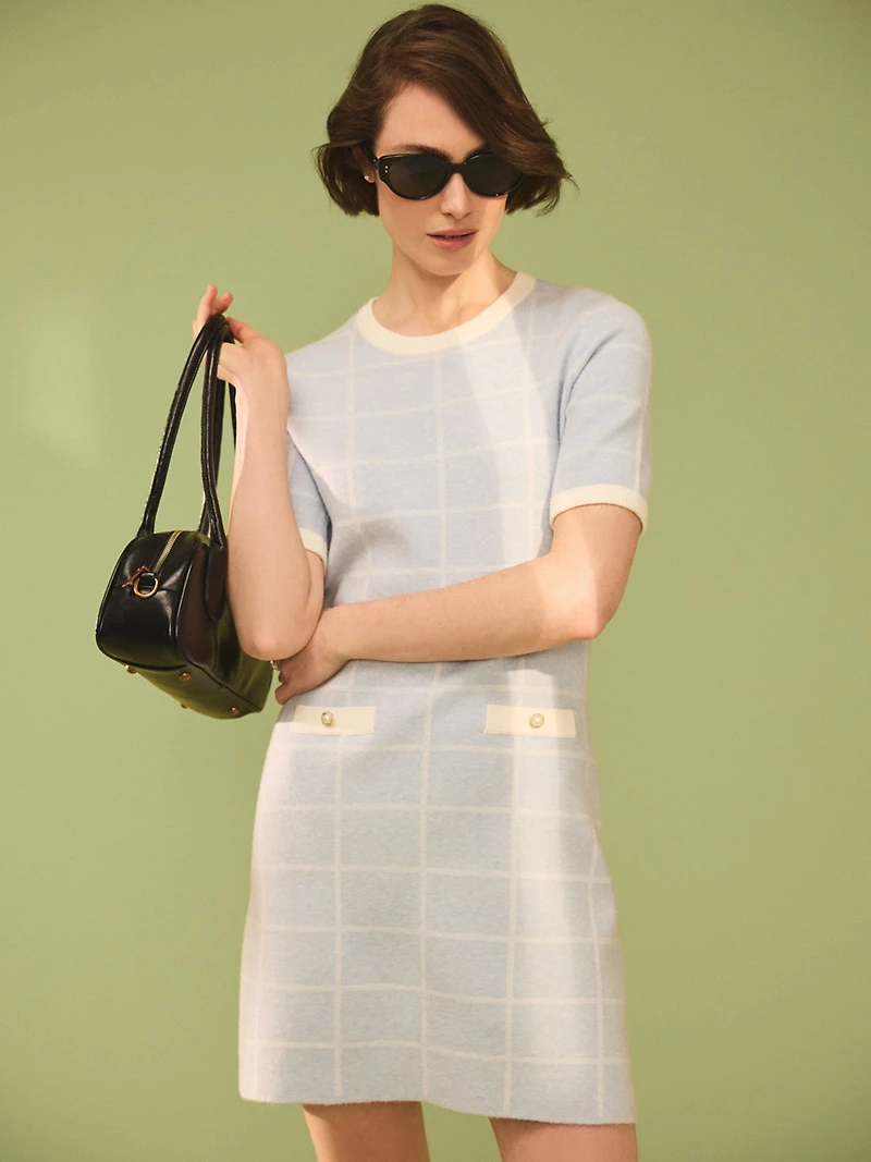 A cozy classic with a modern twist. This plaid mini sweater dress is crafted from a soft, stretchy knit that feels as good as it looks. The contrast piping on the collar and sleeves gives it a playful, preppy finish, perfect for everything from office days to weekend outings Knit sweater dress Soft plaid pattern Round neck Mini White piping on collar and sleeves Fake front pockets Romana is 5.10" and wearing size S Fabric: 50% viscose, 30% polyester, 20% nylon Machine wash on delicate cycle Hang to dry