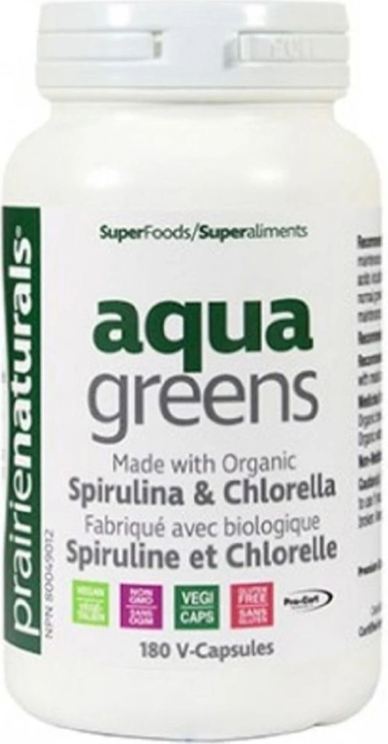 Prairie Naturals - Aqua Greens - 180 Veggie Capsule(s) - NPN: 80049012 -- Prairie Naturals Aqua Greens is a blend of organic chlorella and organic spirulina powders.Aqua Greens support the bodys daily detoxifying process while controlling inflammation, cholesterol, blood sugar and appetite. A natural source of Vitamin B12, prebiotic fibre and disease preventing antioxidants. Made without fillers, binders, excipients or carriers. Perfect for adding to smoothies. Aqua Greens are grown sustainably and organically outside.Contains NO soy, dairy, eggs, gluten, flavours, colours, preservatives, artificial sweeteners or hidden sugars, GMO ingredients, fillers. 100% Vegan. Tested Gluten-free.Ingredients: Organic Broken Cell chlorella (chlorella vulgaris, whole plant), organic Spirulina( spirulina plantensis , whole plant)INGREDIENTS