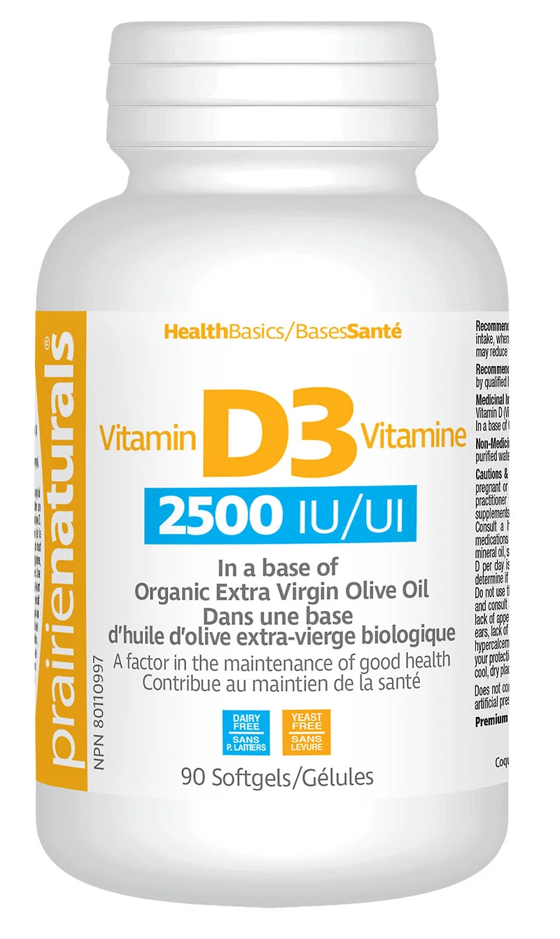 Vitamin D3 form for best absorptionHigh potency of 2500 IUHelps strengthen bonesEssential for good healthVital for strong immunityDescriptionPRAIRIE NATURALS - PRAIRIE NATURALS Vitamin D3 2500 IU - 90 Softgel(s) - NPN: 80110997 -- Chances are, you don't have enough Vitamin D in your diet! Introducing Prairie Naturals D3 in a 2500IU! This single softgel size makes it easy to get enough D3! Summer or winter, our need for Vitamin D is often far greater than we are getting. Researchers now know that previous recommendations for optimal levels of Vitamin D were much too low! Vitamin D not only helps strengthen bones; Vitamin D also protects against dementia, depression, diabetes, obesity and MS.Prairie Naturals Vitamin D3 is made with cholecalciferol, the most readily absorbed form. Be sure you get enough of this low-cost, highly valuable vitamin. Youll soon feel the difference that Vitamin D makes to your health and happiness. Does not contain gluten, soy, egg, dairy, wheat, corn, sweeteners, artificial colour, artificial preservatives, solvents or alcohol. Non-GMO.INGREDIENTSVitamin D (Vitamin D3, Cholecalciferol)……….62.5 mcg (2500 IU)In a base of Organic Olive Oil.Non-Medicinal Ingredients: Organic Olive Oil (cold-pressed, extra virgin), gelatin, purified water, glycerin.
