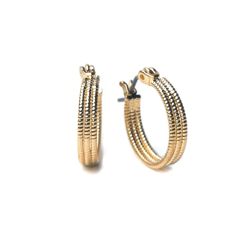 Primavera - Medium sized gold plated three row textured hoops. In a class by itself. Fine quality and timeless designs are the hallmarks of this collection. Made from sustainable materials | Primavera Jewellery Primavera Textured Graduating Hoop Earrings in Gold