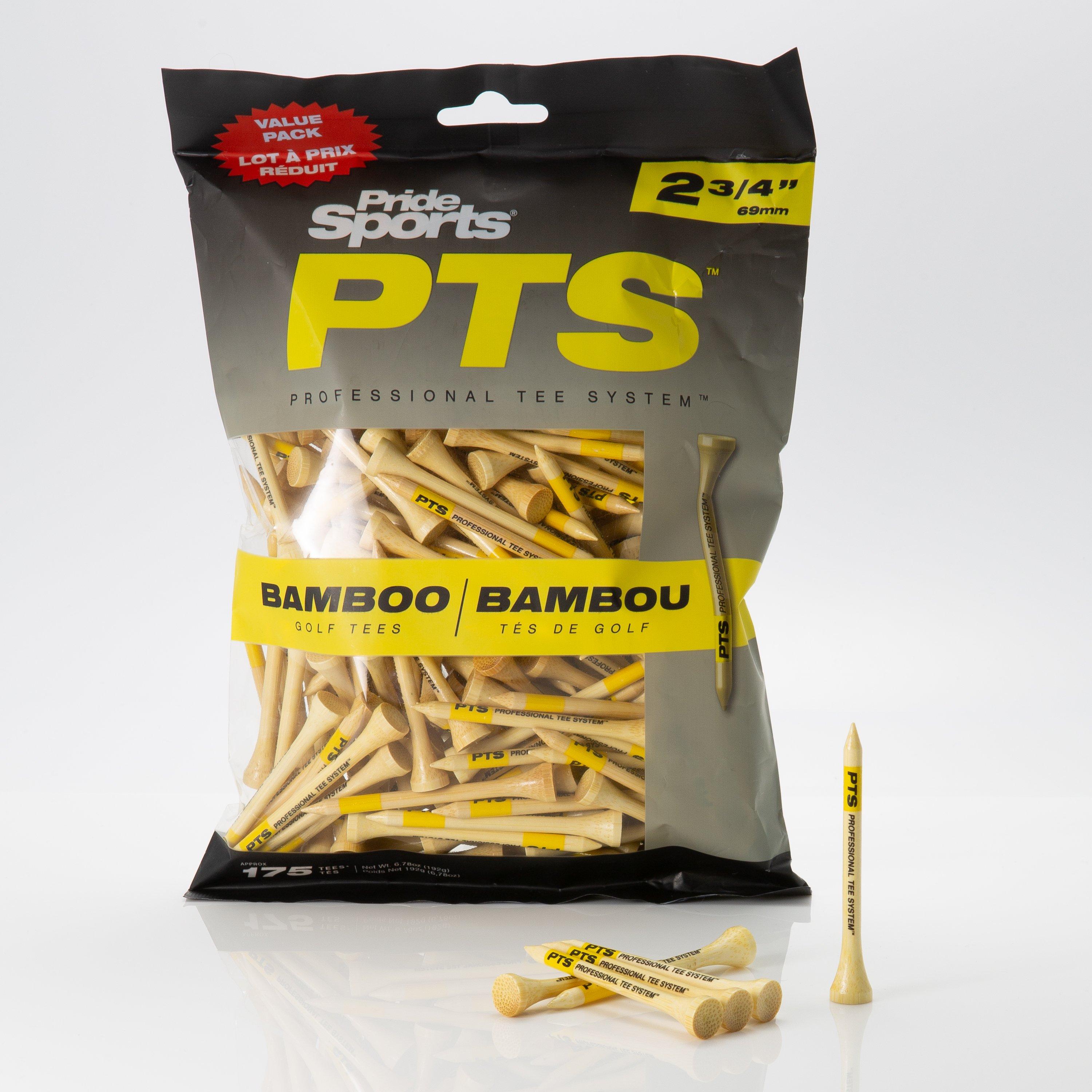 Professional Tee System™ (PTS) is a proprietary system of printed golf tees that allows for easy identification of length an appropriateness for various golf clubs. Available in Natural Bamboo, one of the most rapidly renewing resources for tees on Earth.
