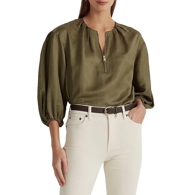 Quarter-Zip Puffy Shantung Blouse