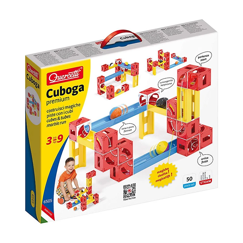 With Cuboga, the marbles run flat along the tracks or even upwards thanks to the special internal design of the cubes which push the marbles forward and magically increase their speed. Tons of fun guaranteed.